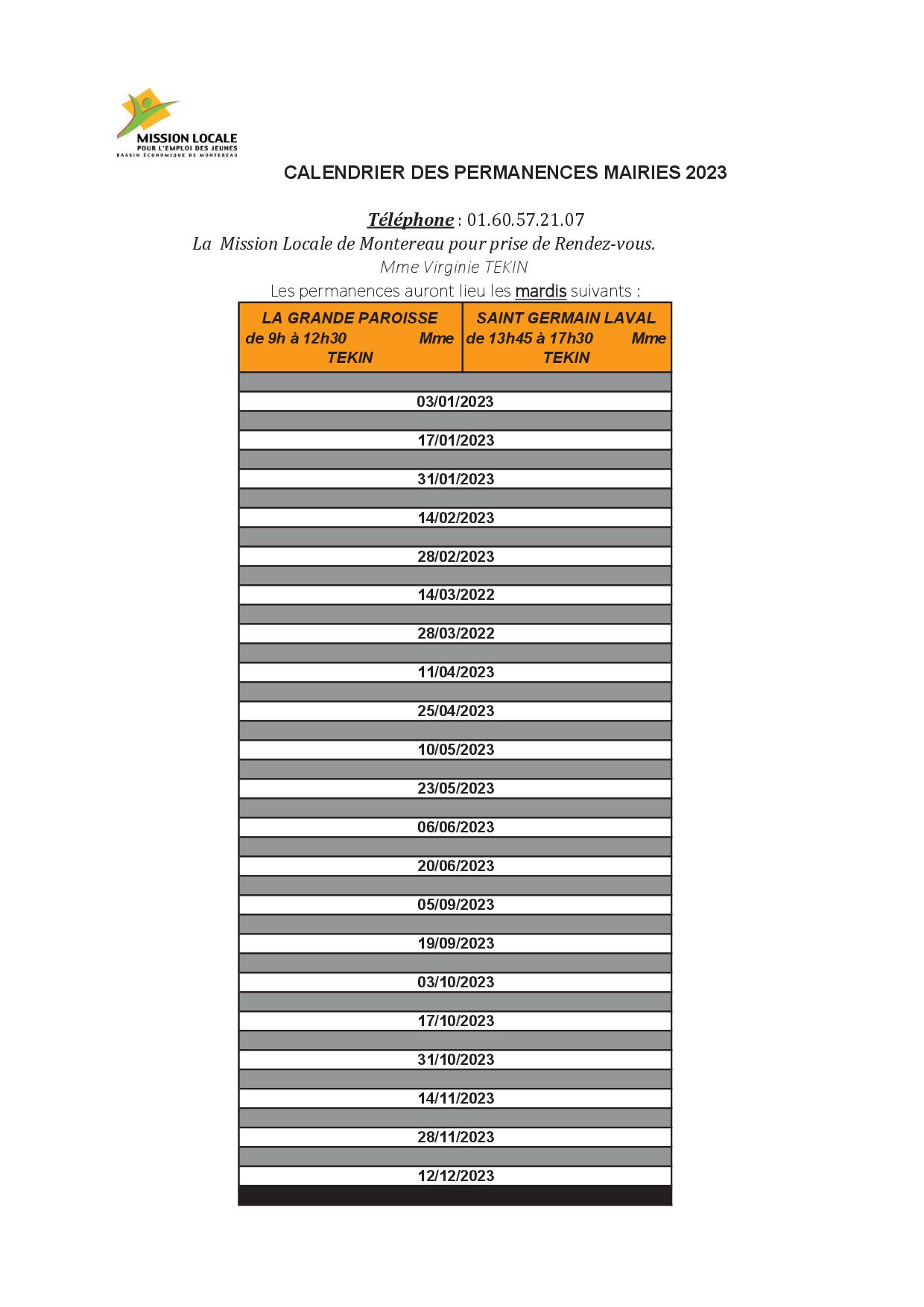Les permanences de la Mission Locale à la mairie de La Grande Paroisse auront lieu les mardis suivants de 9h à 12h30 avec Mme Virginie TEKIN.