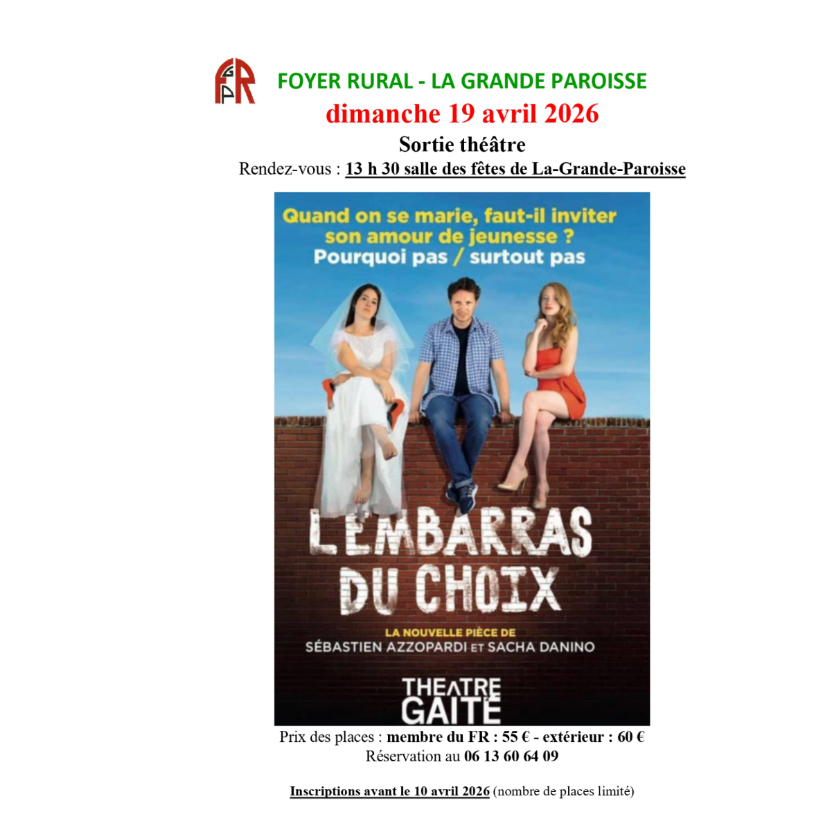 Sortie Théâtre avec le Foyer Rural. Inscription avant le 10 avril au 06 13 60 64 09, attention places limitées.