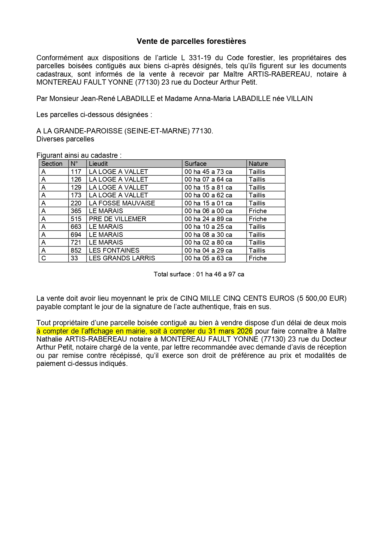 Tout propriétaire d’une parcelle boisée contiguë au bien à vendre dispose d’un délai de deux mois à compter de l’affichage en mairie, soit à compter du 31 mars 2026 pour faire connaître à Maître Nathalie ARTIS-RABEREAU notaire à MONTEREAU FAULT YONNE (77130) 23 rue du Docteur Arthur Petit, notaire chargé de la vente, par lettre recommandée avec demande d’avis de réception ou par remise contre récépissé, qu’il exerce son droit de préférence au prix et modalités de paiement ci-dessus indiqués.